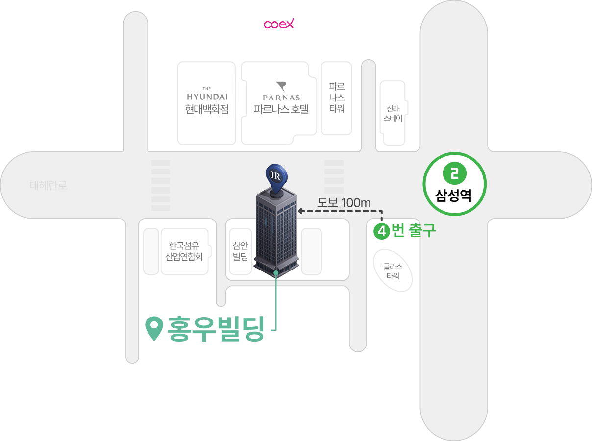 삼성역 하차 후 4번 출구 직진 보도 약 100m